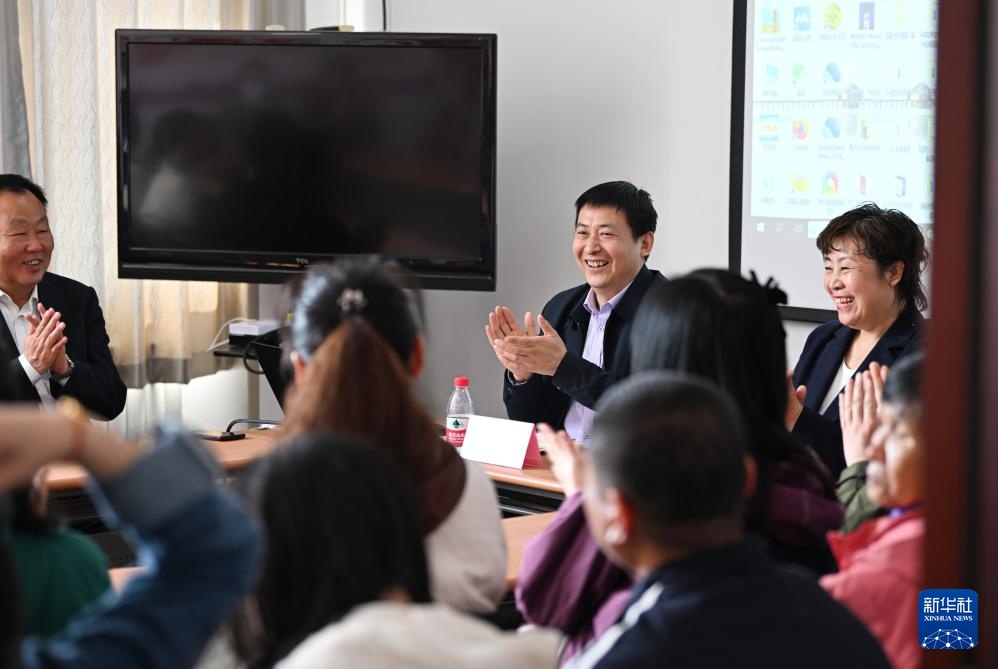 张振连(中)在天津市滨海新区大港街道开元里社区进行两会精神宣讲(4月10日摄)。