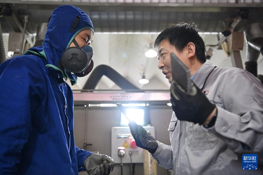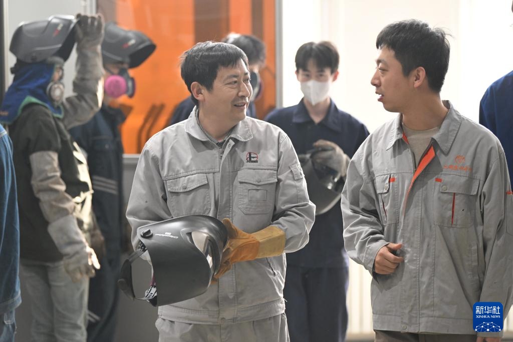 张振连(右)在天津职业技术师范大学焊接实训室指导学生(4月23日摄)。