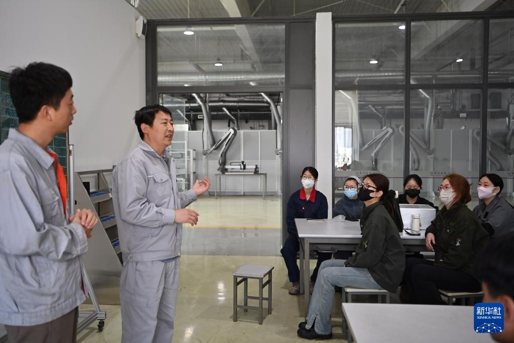 张振连(前左)在天津职业技术师范大学和实训教师交流(4月23日摄)。