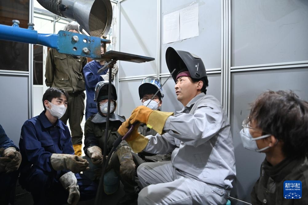 在天津职业技术师范大学焊接实训室,张振连(右二)给学生讲解焊接要领(4月23日摄)。