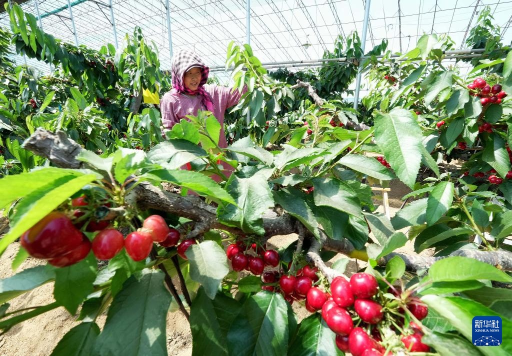 4月25日,河北省卢龙县蛤泊镇两县店村益民家庭农场的工人在大棚内采摘樱桃。