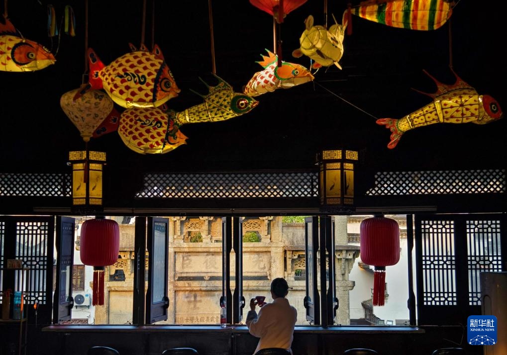3月18日,游客在安徽歙县徽州古城内的咖啡馆内休息。