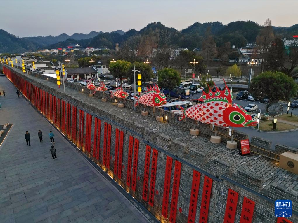 这是3月19日航拍的安徽歙县徽州古城城墙上的鱼灯。