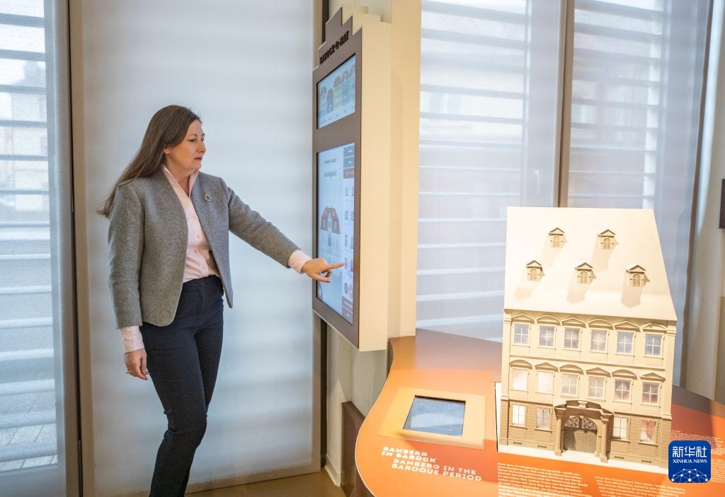 3月24日,在德国班贝格古城,班贝格世界遗产中心主任西蒙娜·冯·艾布介绍中心内展览的互动装置。