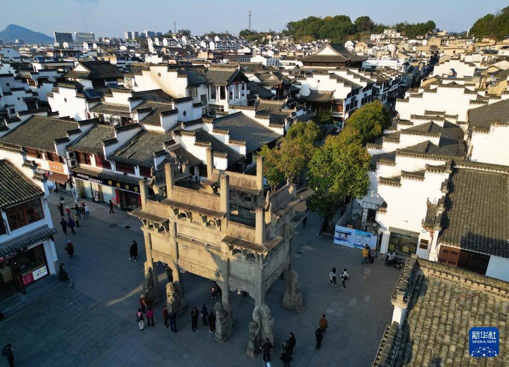 这是3月19日航拍的安徽歙县徽州古城内的许国石坊。