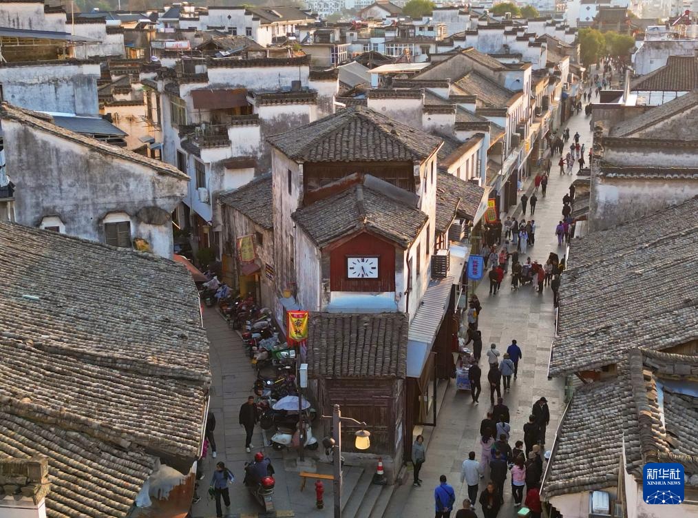 这是3月19日航拍的安徽歙县徽州古城内拍摄的中和街钟楼。