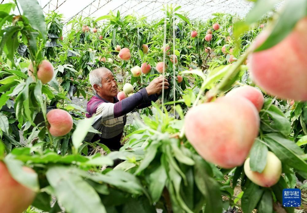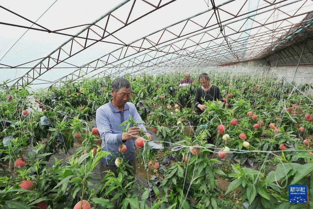 4月26日,河北省昌黎县两山乡河西张各庄村东义果蔬种植专业合作社的社员在大棚内管护即将成熟的鲜桃。