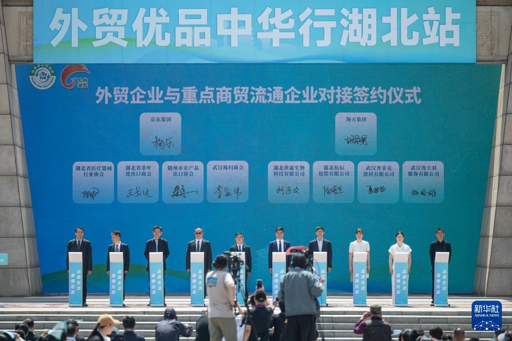 当日,外贸优品中华行湖北站暨“乐购湖北”消费季活动在武汉市汉口北国际贸易城启动。活动旨在打造出口产品拓内销的标志性平台,通过系列专题对接活动,助力外贸企业开拓国内市场,促进消费升级。在启动仪式现场,约200家省内外的外贸企业、近100家流通企业现场开展对接,签约金额145亿元。