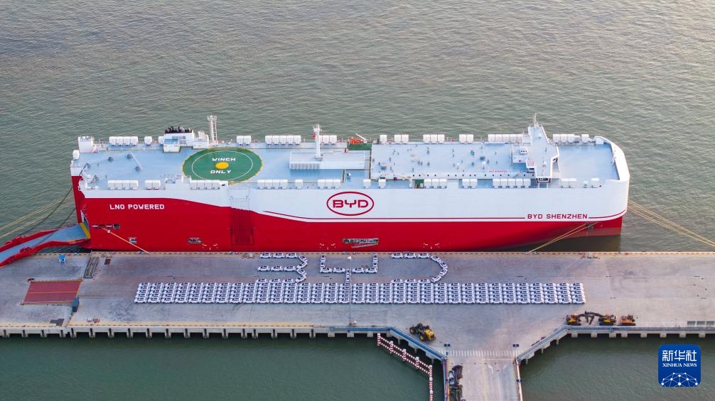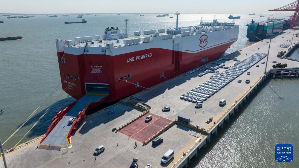 近日,江苏苏州港太仓港区码头一片繁忙,全球最大装载量汽车运输船“深圳号”在此进行装车作业,随后将装载着比亚迪汽车开启首航。该船全长219.9米、宽37.7米,配备16层甲板,可装载9200辆标准车。由比亚迪自主运营的“深圳号”,系其投运的第四艘专业汽车滚装船。
