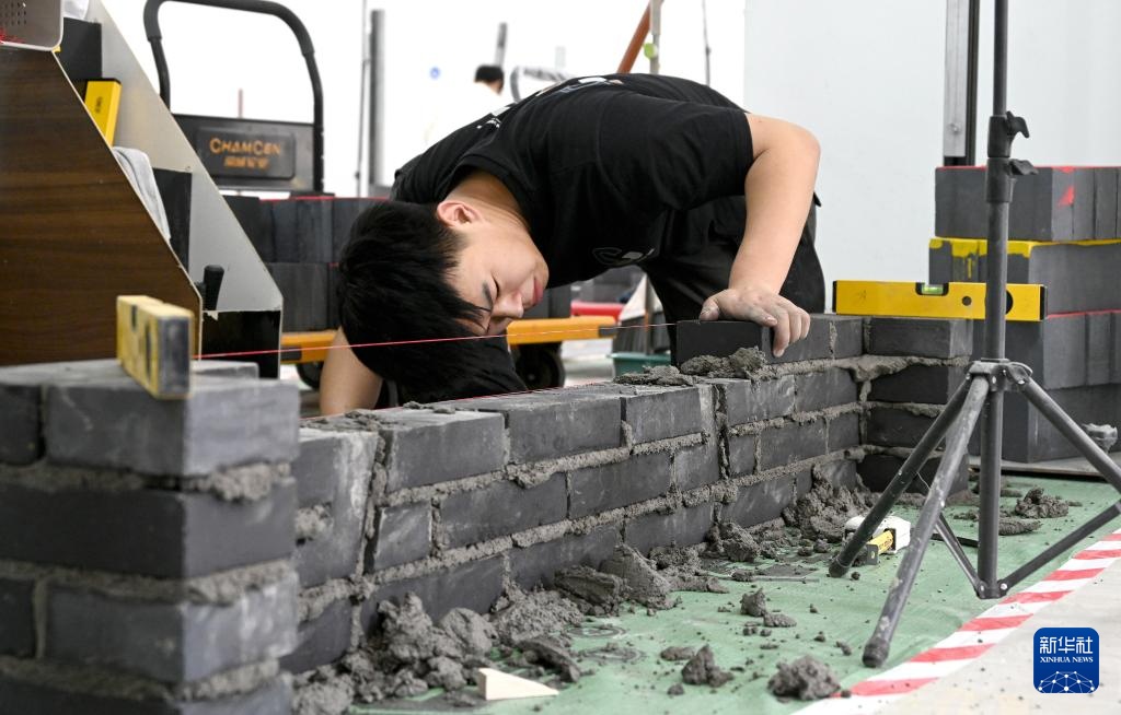 4月26日,选手在“砌筑”项目比赛中。