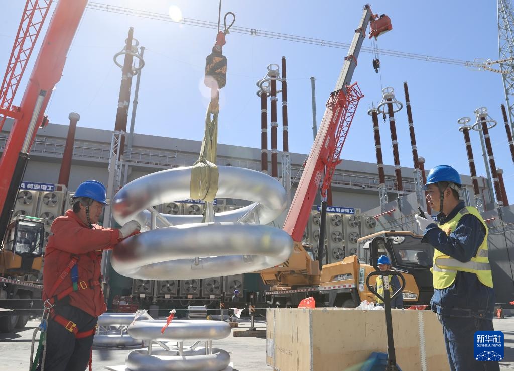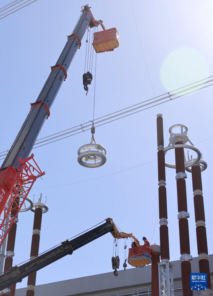 在“疆电入渝”特高压工程巴里坤换流站,施工人员在开展网侧套管均压环安装(4月24日摄)。