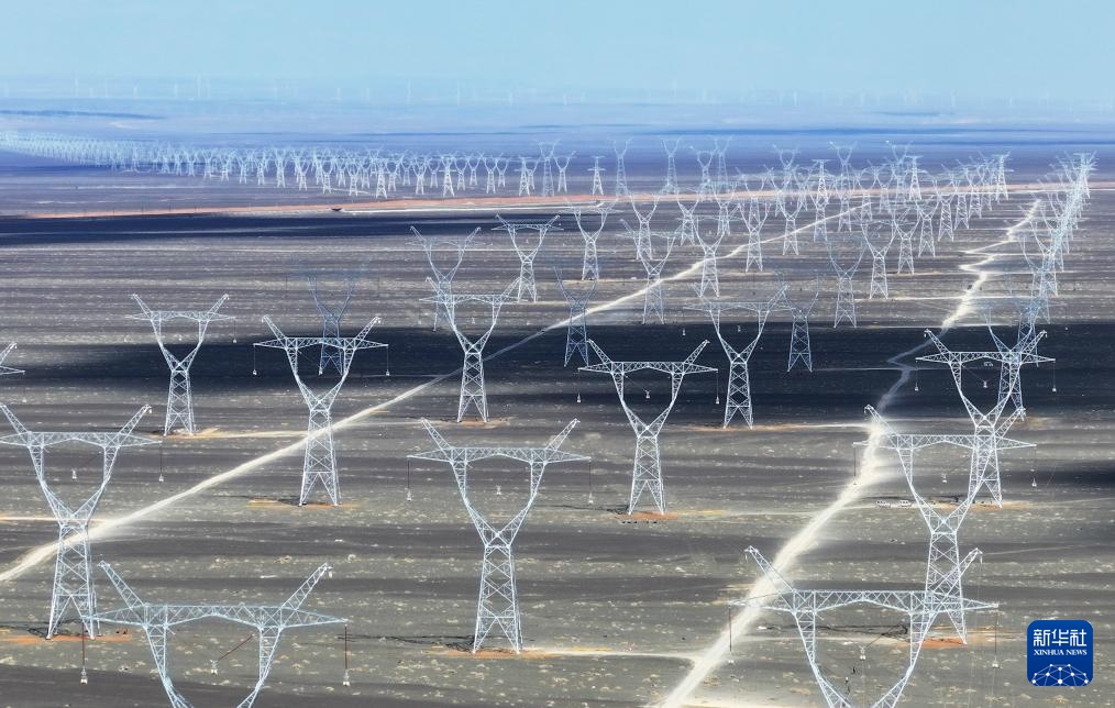 这是4月26日在新疆哈密地区三塘湖镇附近拍摄的“疆电入渝”特高压工程(无人机照片)。
