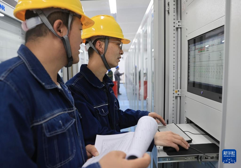 在“疆电入渝”特高压工程巴里坤换流站,运行人员张自成(左)和李少华在进行交流滤波器操作功能验证(4月24日摄)。
