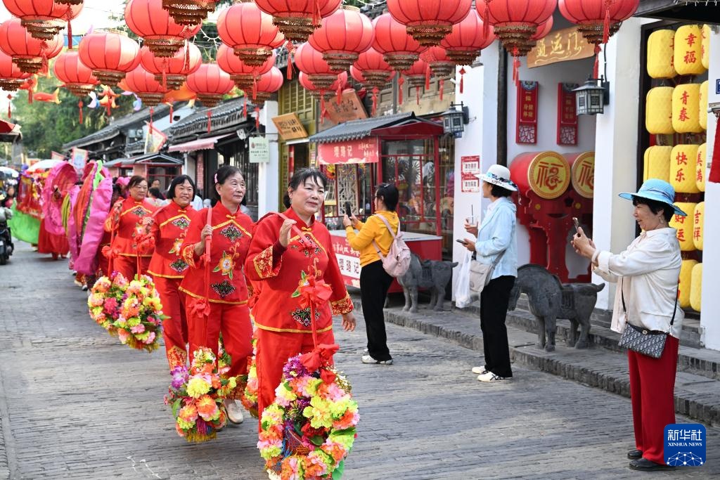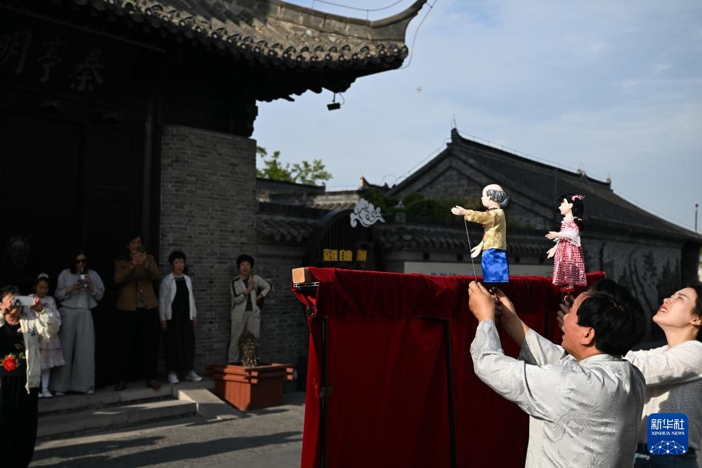 当日,在江苏省高邮市运河·盂城驿街区,木偶戏、挑花担、撂石锁等非遗项目表演吸引众多游人驻足观看。