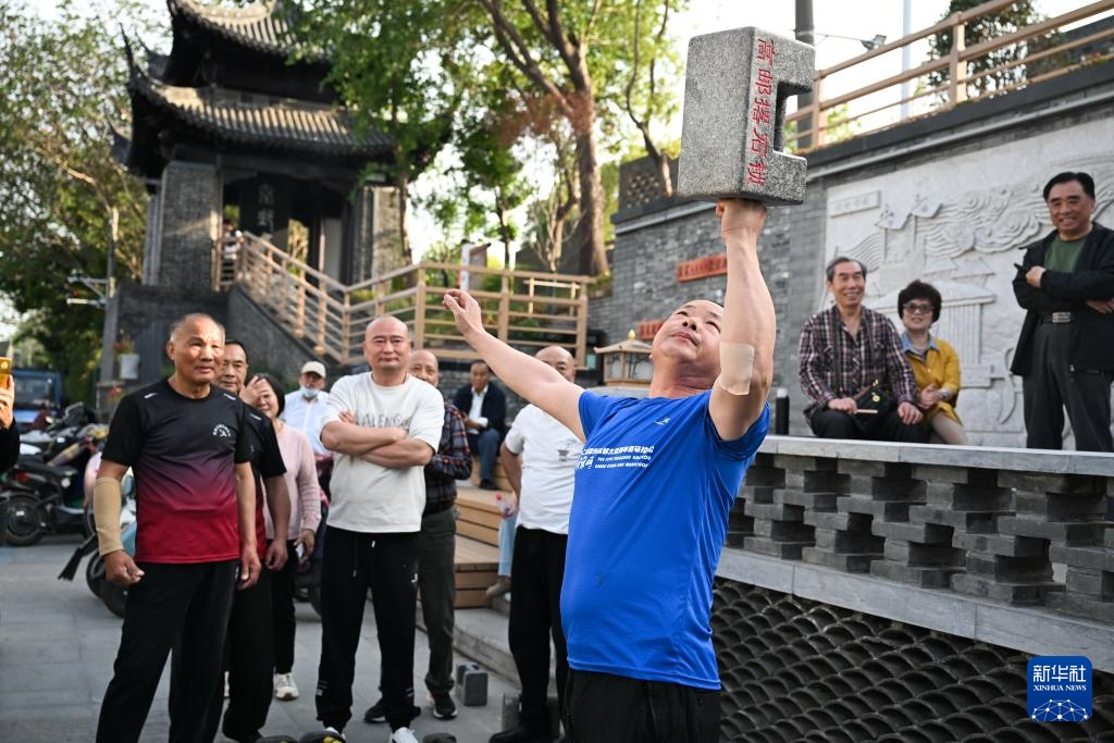 4月27日,群众在表演撂石锁。