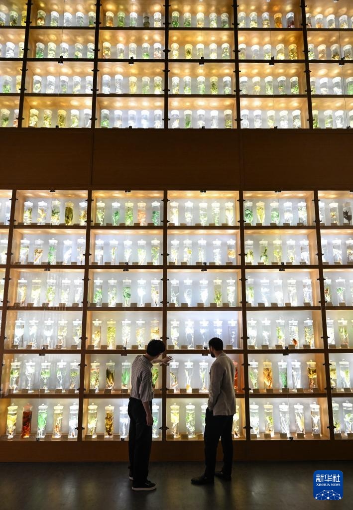 4月24日,在南京中医药大学内的江苏省中医药博物馆,李小龙(右)和同学观看浸制标本。
