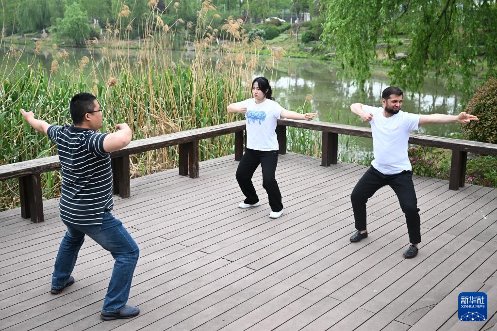 4月24日,在南京中医药大学,李小龙(右)和同学在针灸推拿学院王宇航老师(左)指导下练习中医功法。