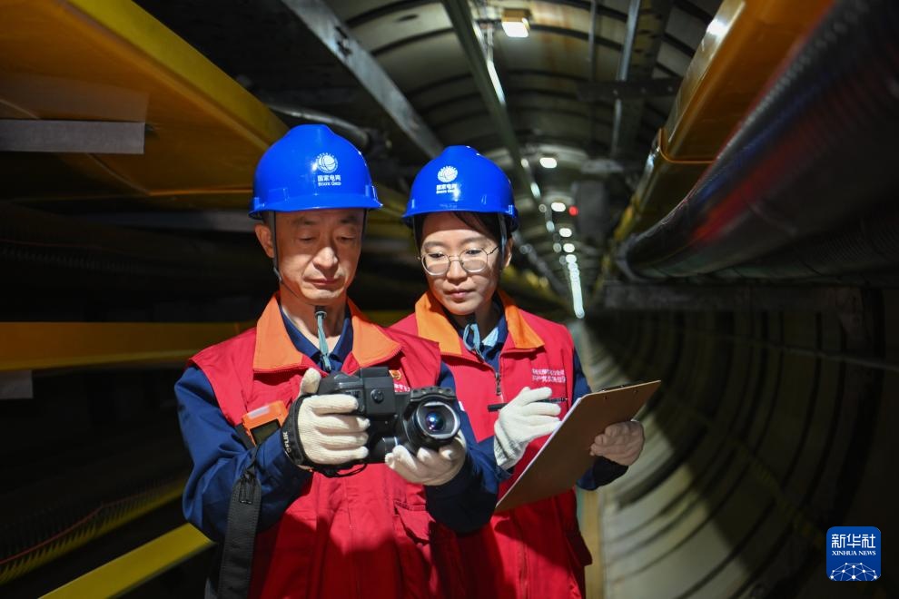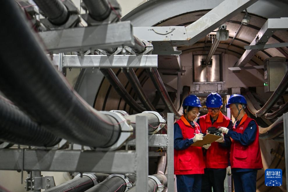 张华(左)与班组成员在天津延吉道220千伏电缆隧道使用热成像仪开展特巡(4月26日摄)。