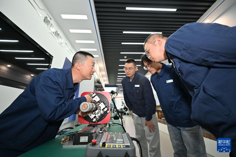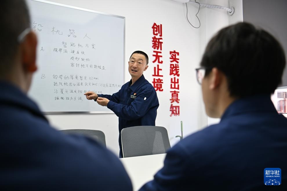 在国家电网天津电缆公司张华劳模创新工作室,张华(左一)为青年讲解他创新研发的电缆搪铅机器人(4月26日摄)。