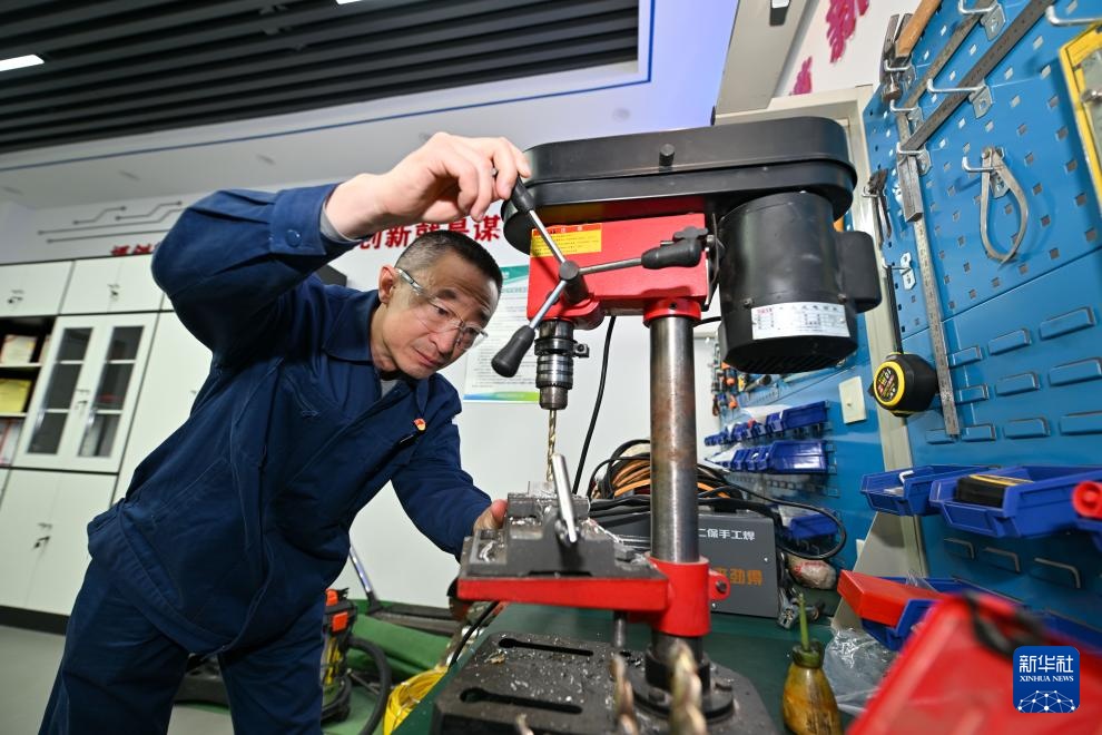 在国家电网天津电缆公司张华劳模创新工作室,张华运用机械设备加工一日常工作中使用的绝缘模块(4月26日摄)。