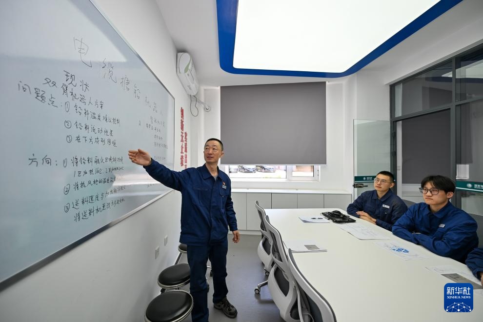 在国家电网天津电缆公司张华劳模创新工作室,张华(左)为青年讲解创新思路(4月26日摄)。
