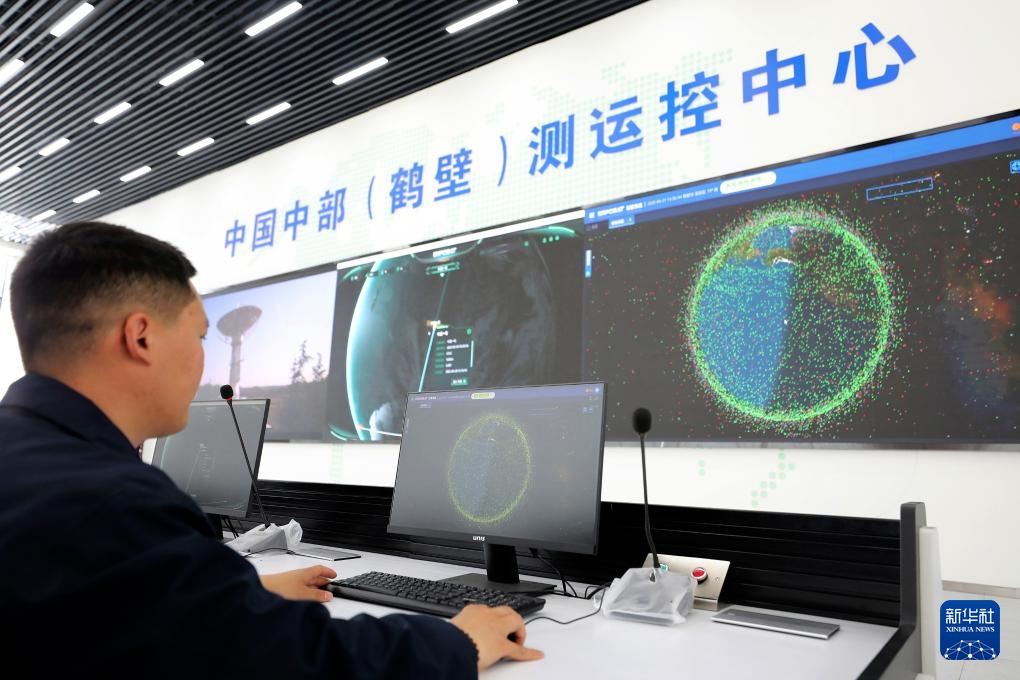 4月21日,工作人员在中国中部(鹤壁)测运控中心查看卫星运行情况。