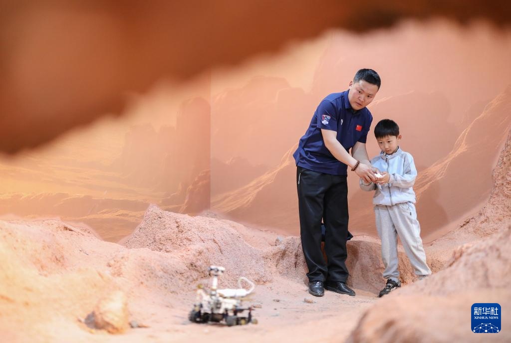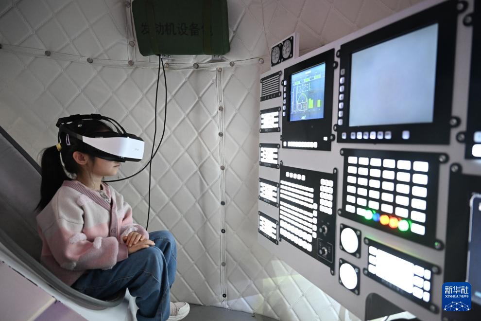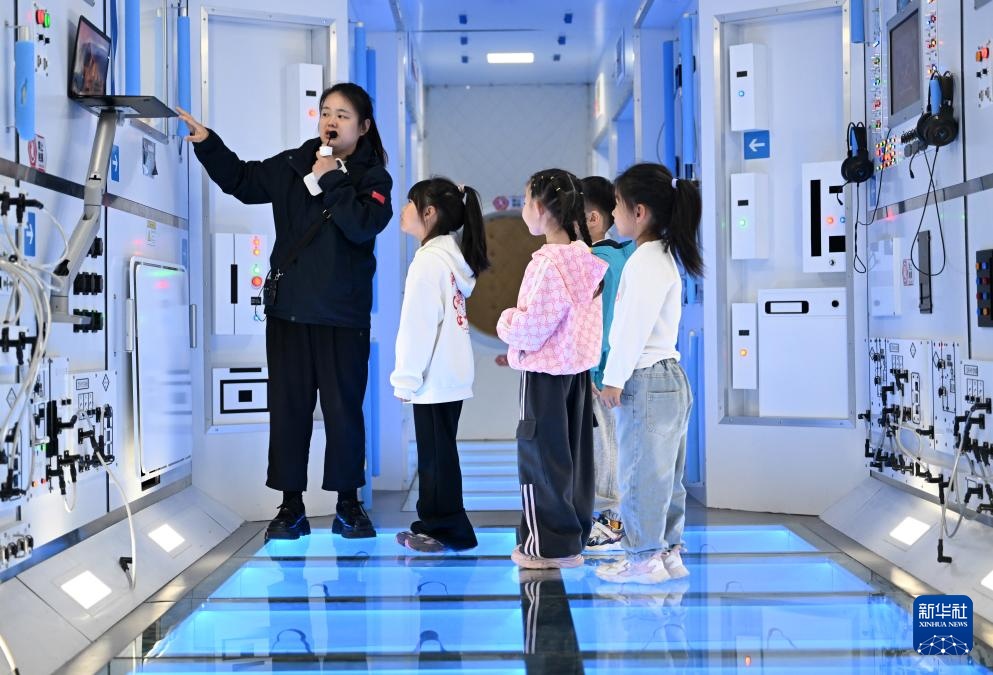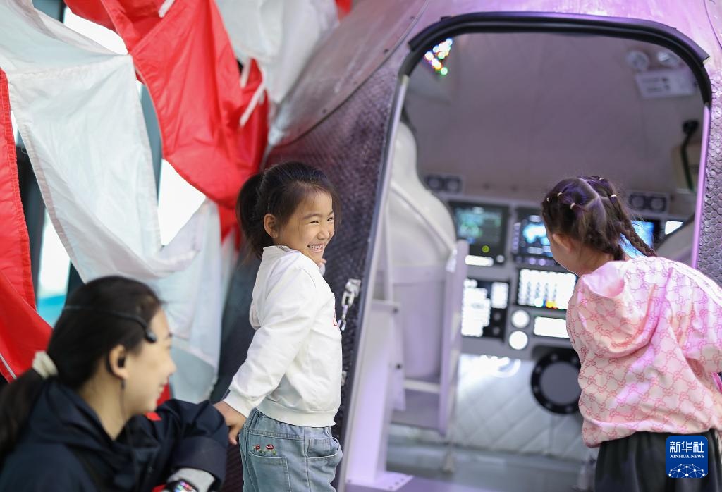 4月21日,小朋友在豫见宇宙航天探索中心的空间站模型中参观。豫见宇宙航天探索中心位于鹤壁市卫星智造产业园,是集沉浸式游览、航天任务体验、航天科普教育功能为一体的航天科普研学基地。