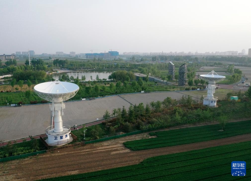 4月20日在鹤壁市卫星智造产业园附近拍摄的卫星地面基站天线(无人机照片)。