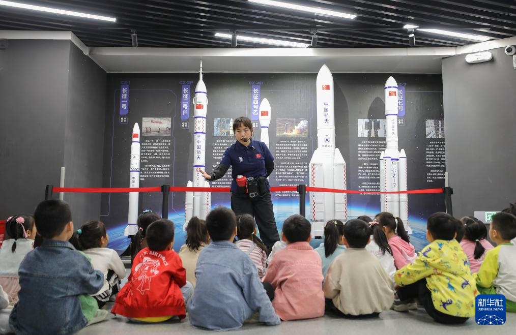4月21日,在豫见宇宙航天探索中心,讲解员为参加研学的小朋友介绍火箭知识。豫见宇宙航天探索中心位于鹤壁市卫星智造产业园,是集沉浸式游览、航天任务体验、航天科普教育功能为一体的航天科普研学基地。
