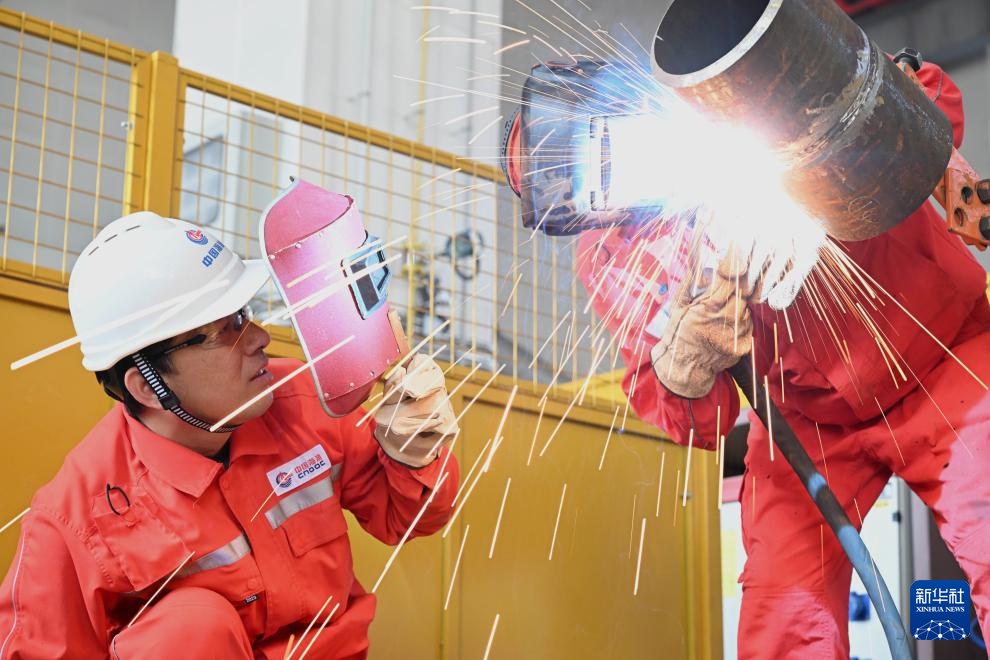 4月29日,在位于海油工程天津智能制造基地的工作室,刘海林(左)和同事对一款新型焊接材料进行试验焊接。