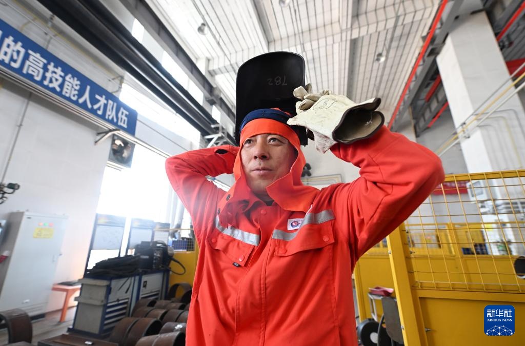 4月29日,刘海林在位于海油工程天津智能制造基地的工作室戴上焊接面罩,准备进行焊接作业。
