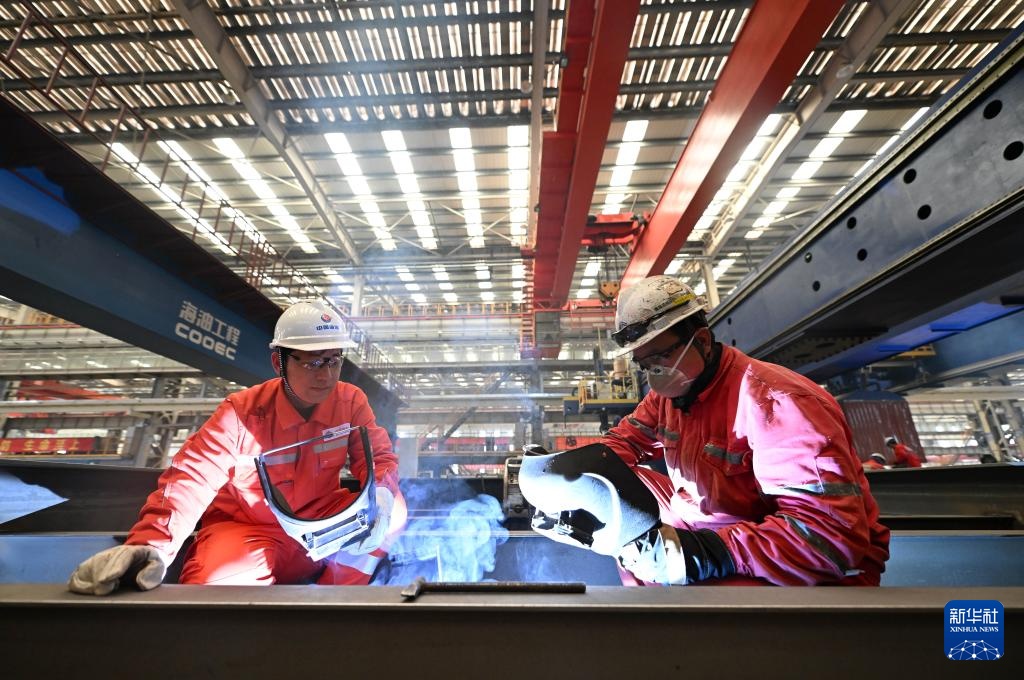 4月29日,在海油工程天津智能制造基地结构预制车间,刘海林(左)指导同事进行焊接作业。