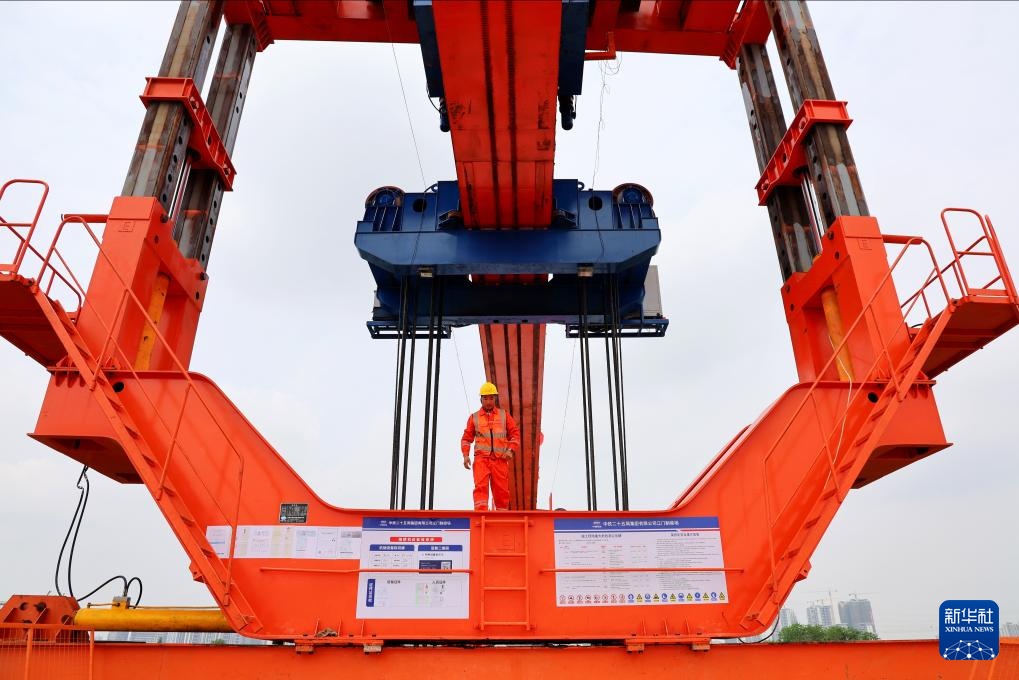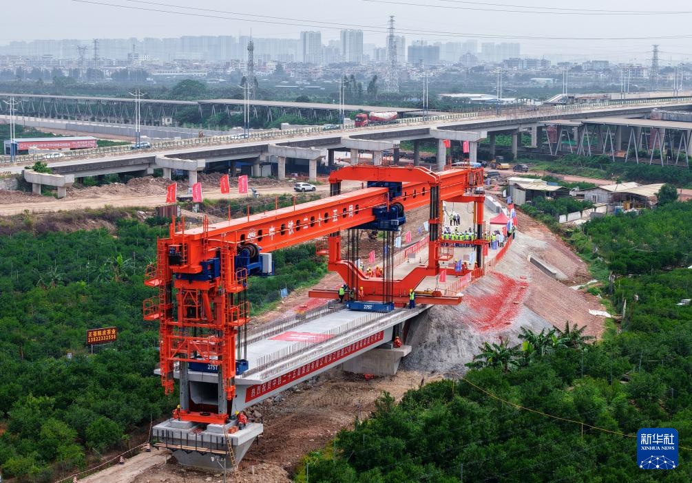 4月30日拍摄的深江铁路江门段首榀预制箱梁架设现场(无人机照片)。