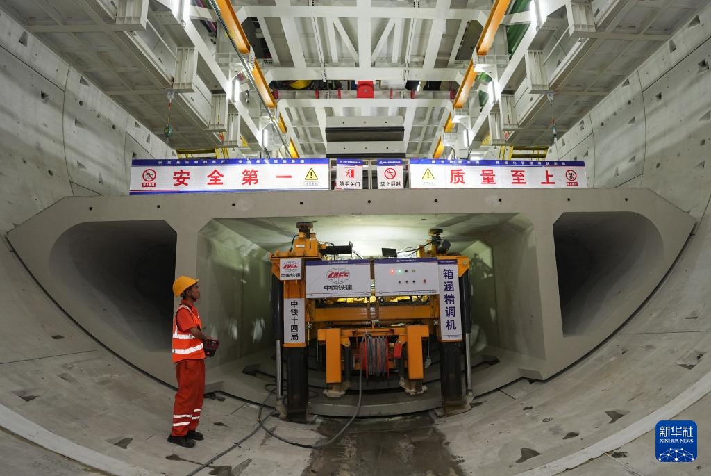 4月30日,中铁十四局技术人员在甬舟铁路金塘海底隧道“甬舟号”盾构机内操控箱涵精调机,以实现近40吨重的弧形构件拼装精度控制在1毫米以内。