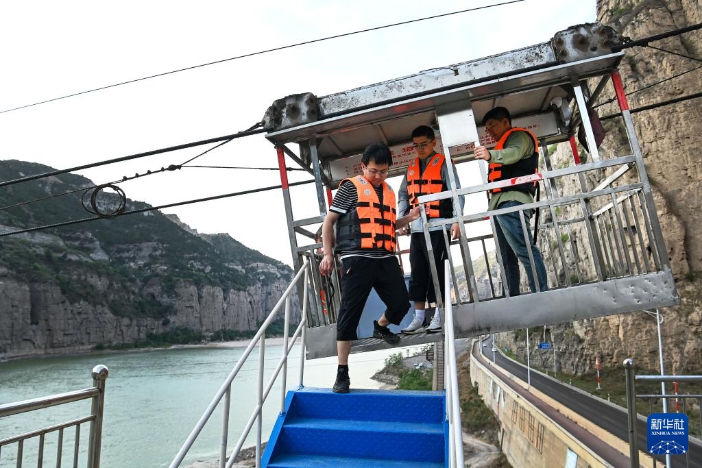 4月28日,龙门水文站负责人李超华(左)和同事乘坐吊箱抵达对岸。