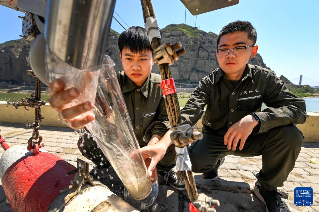 4月28日,23岁的龙门水文站技术员刘锦阳(左)和27岁的测验组组长张洋将采样器中的黄河水倒入刻度瓶。