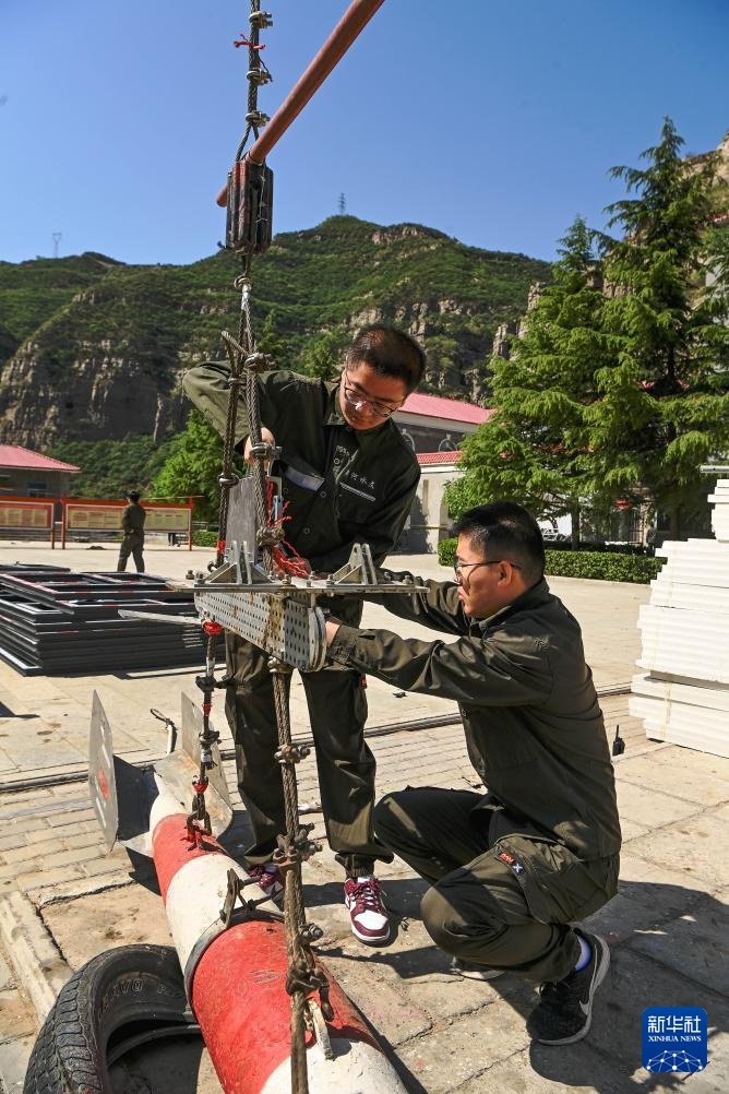 4月28日,25岁的龙门水文站水情组副组长霍鸣冲(左)和27岁的测验组组长张洋在安装取沙采样器。