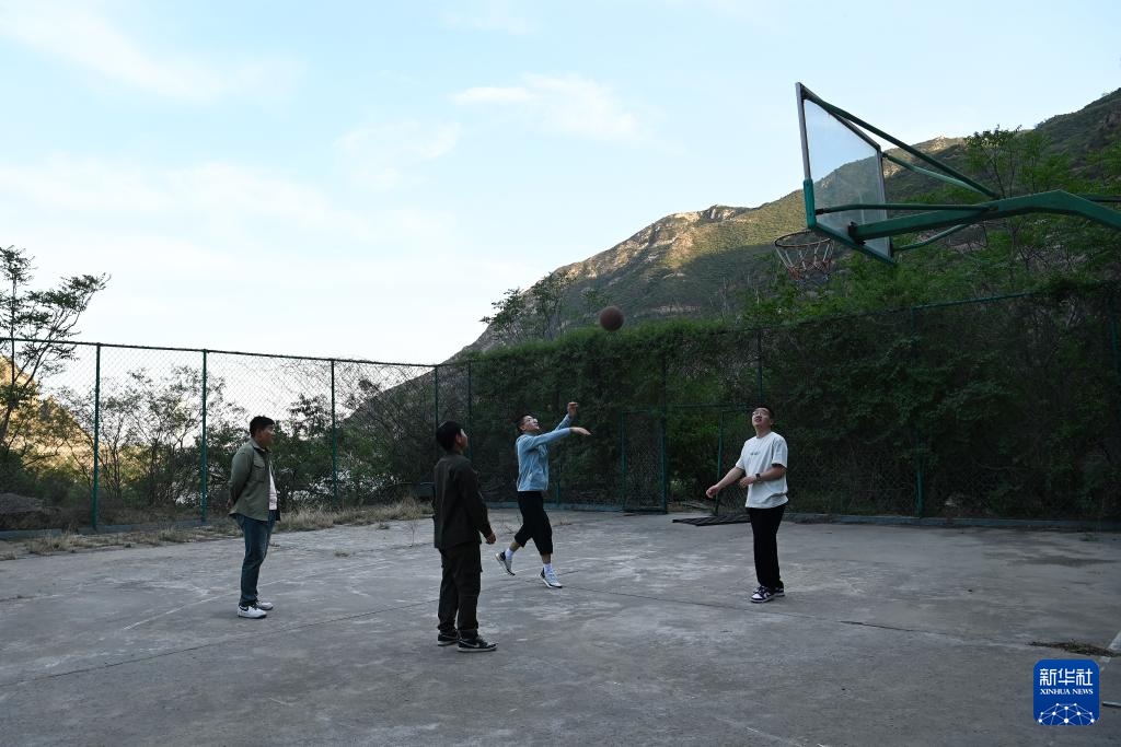 4月28日,青年职工下班后在龙门水文站的篮球场打球。