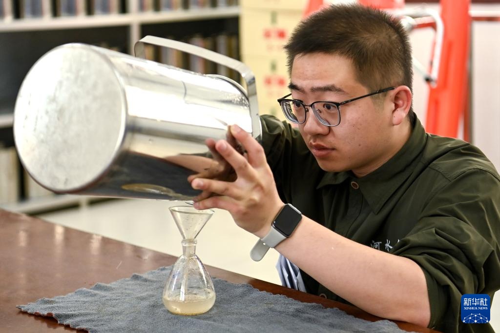 4月28日,龙门水文站水情组副组长霍鸣冲在整理取样筒。