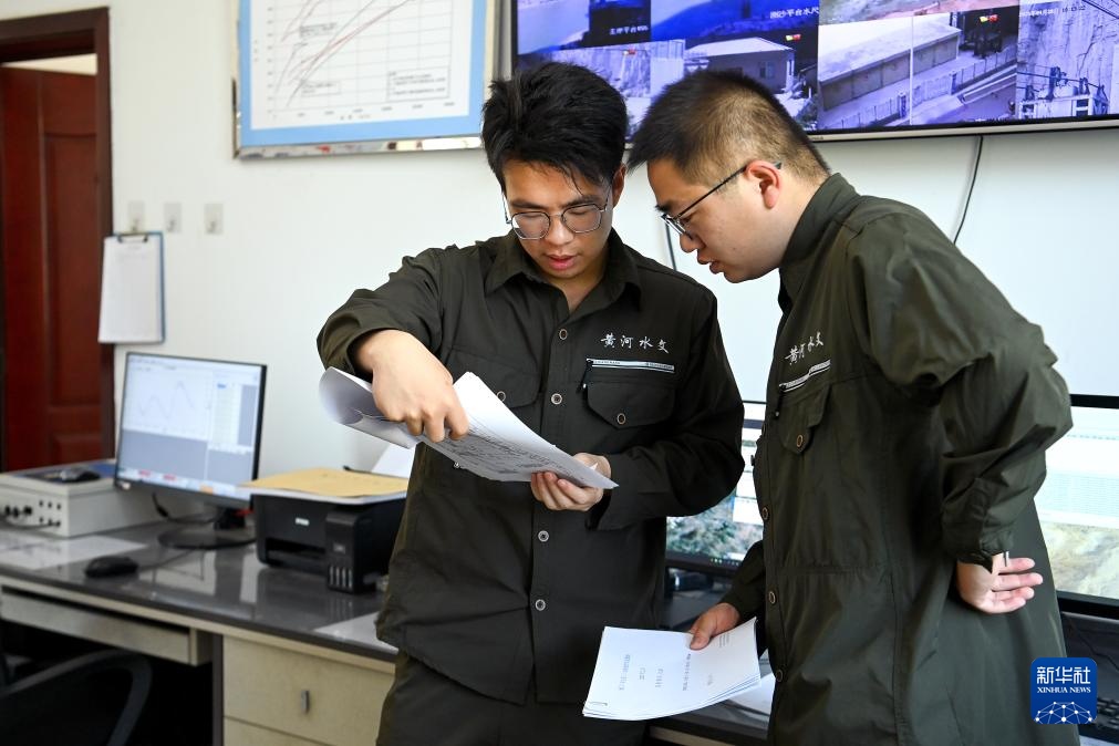 4月28日,26岁的龙门水文站水情组组长甘源(左)与25岁的水情组副组长霍鸣冲一起核对水文数据。