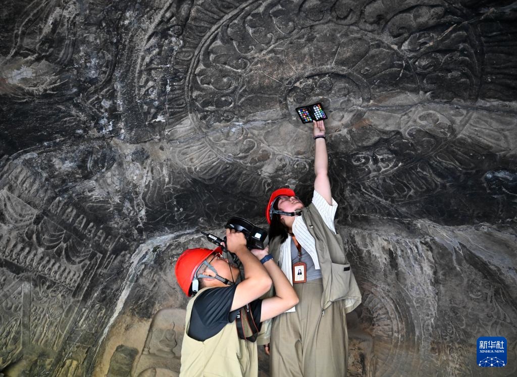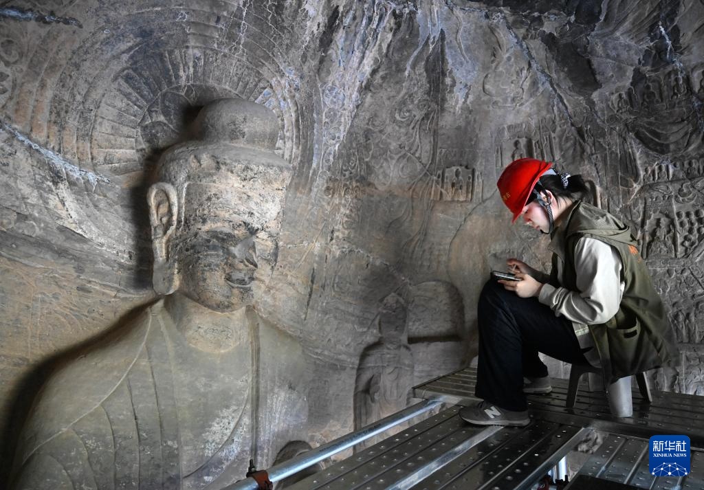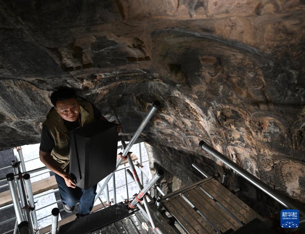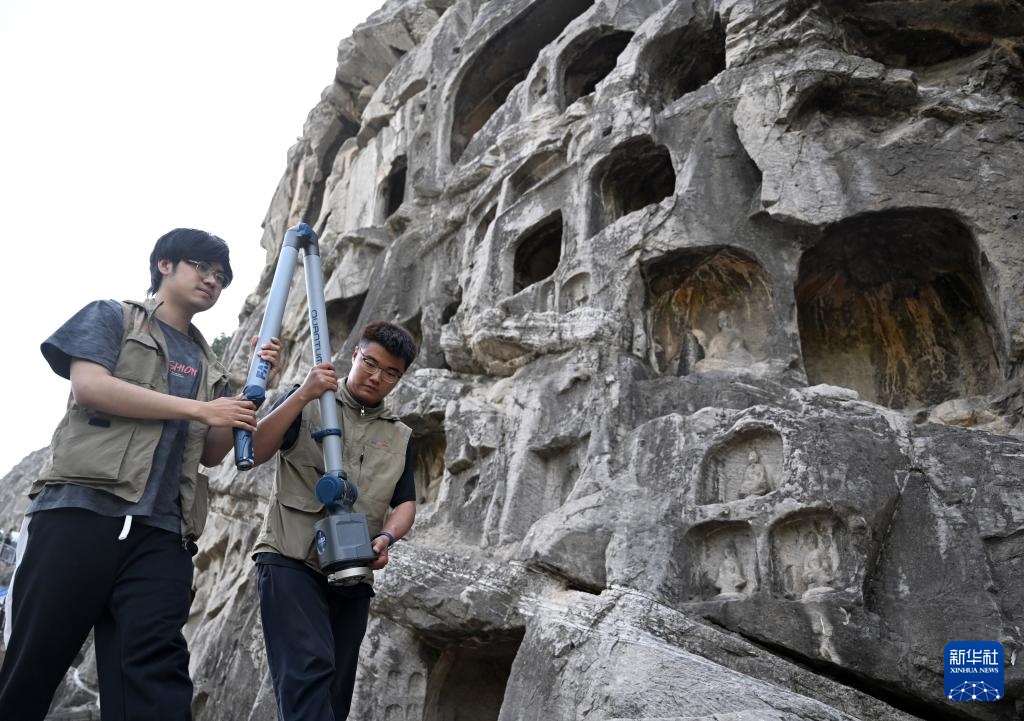 4月10日,武汉大学文化遗产智能计算实验室团队成员(下)与龙门石窟研究院工作人员在魏字洞进行高清摄影扫描。