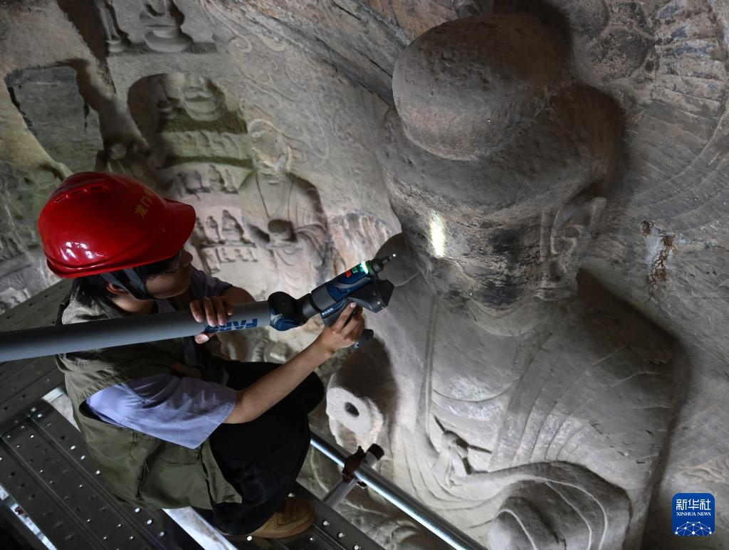 4月9日,龙门石窟研究院工作人员在古阳洞使用关节臂扫描仪对像龛进行数字化扫描。