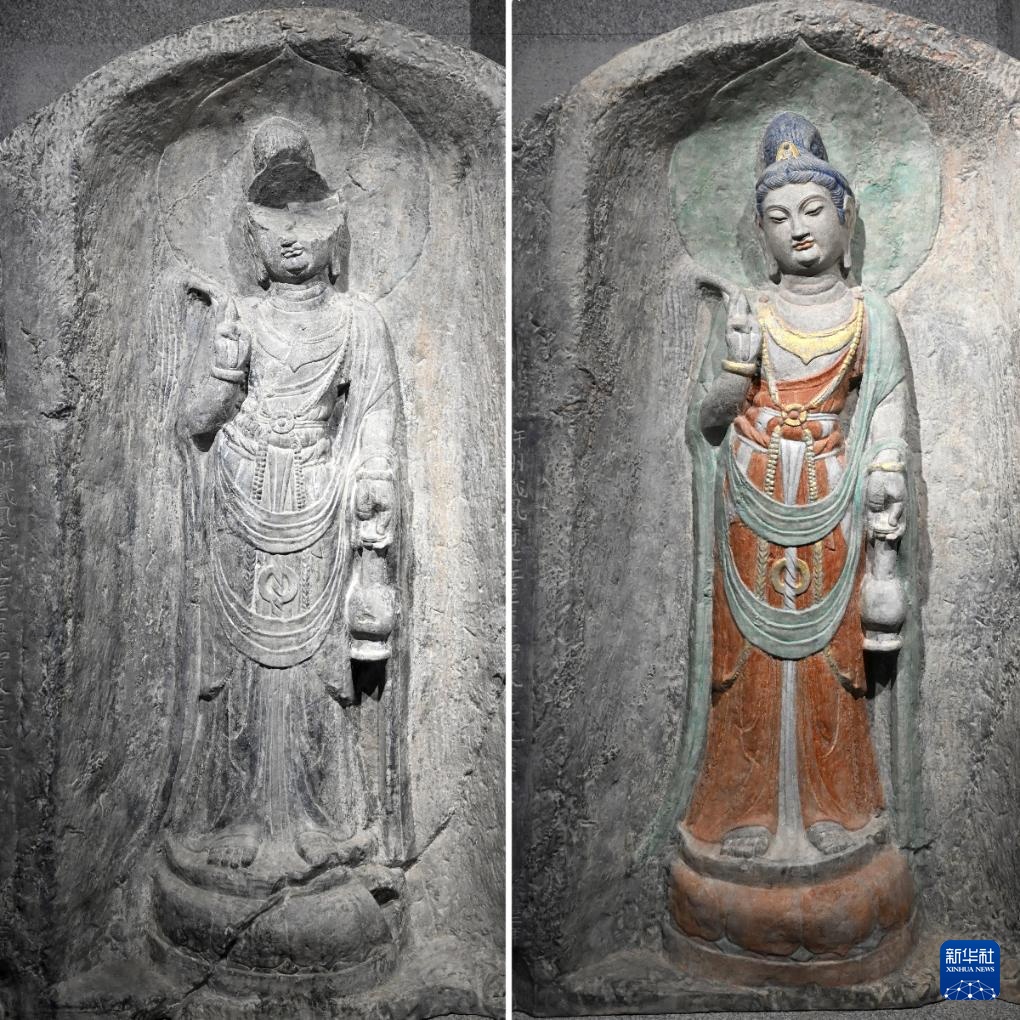 左图为龙门石窟万佛洞窟前南壁菩萨造像的3D打印模型;右图为利用数字化技术复原后的3D打印模型(4月10日摄,拼版照片)。复原后的像龛精妙绝伦,栩栩如生,被游客誉为“龙门最美菩萨”。