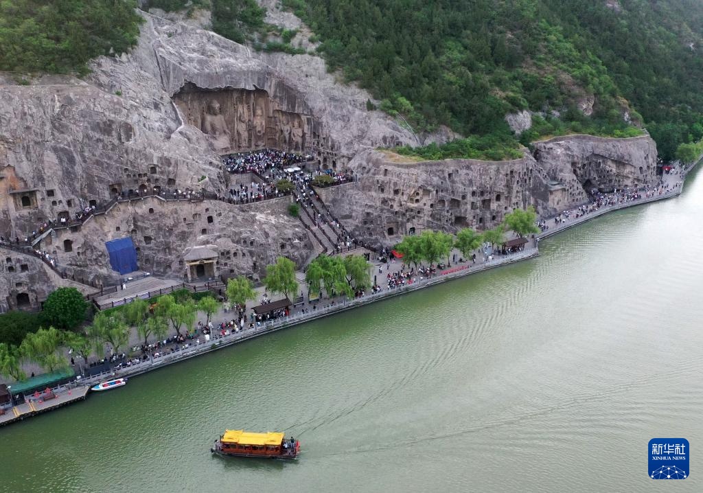 4月24日,游客在龙门石窟游玩(无人机照片)。