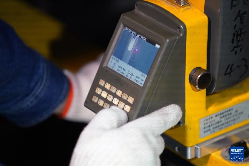 在哈尔滨地铁2号线南直路站,地铁供电维保检修班组技术员卢旺在隧道内查看勘测的相关技术参数(4月30日摄)。