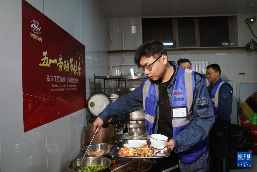 地铁供电维保检修工徐博宇(前)在作业前打饭就餐(4月29日摄)。