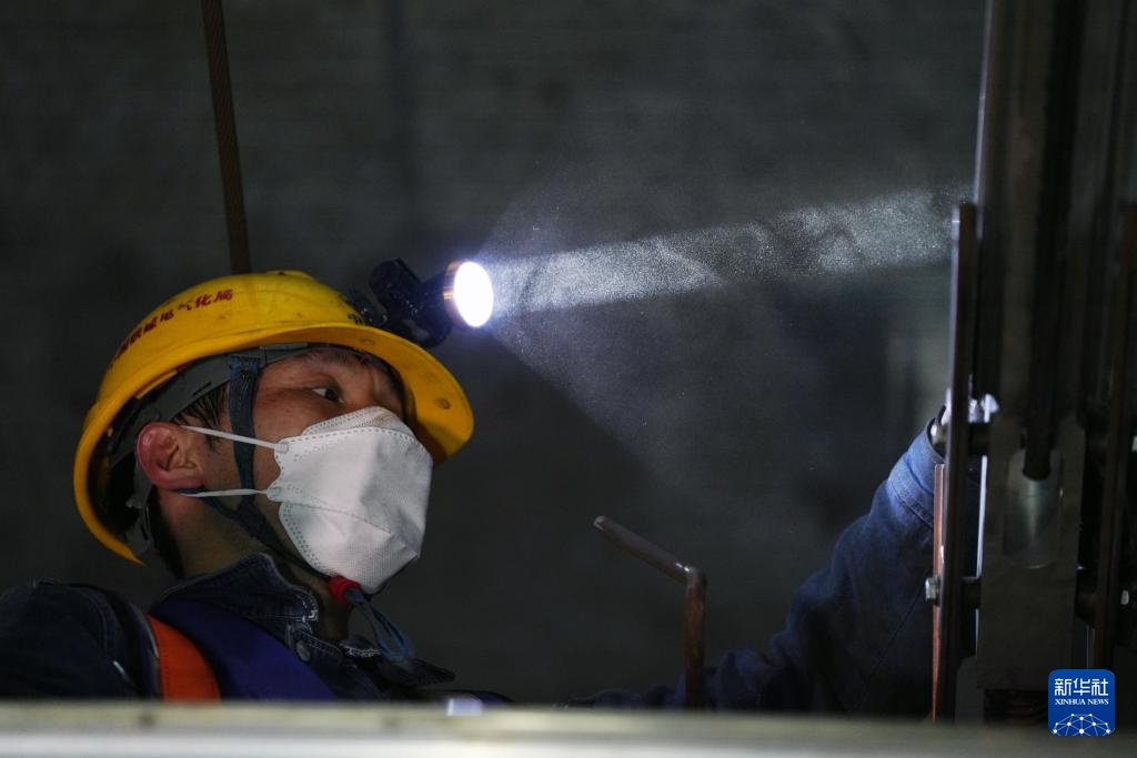 在哈尔滨地铁2号线南直路站,地铁供电维保检修工人何海飞在隧道内作业(4月30日摄)。