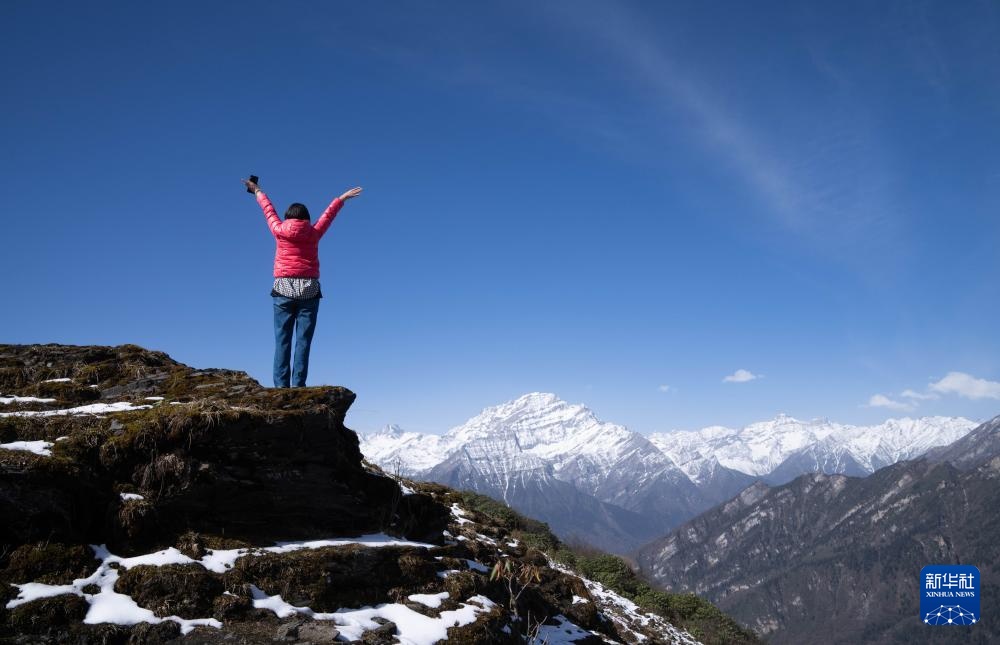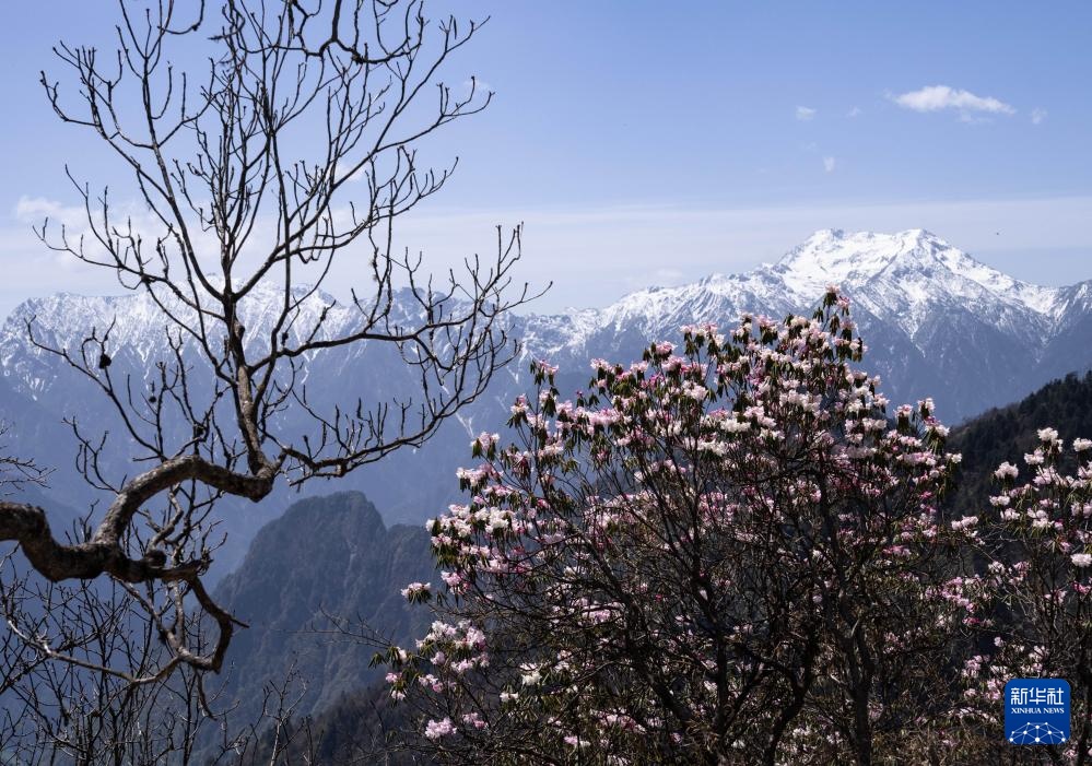 5月1日,游客在平武县虎牙藏族乡的土地梁山垭上眺望雪山。