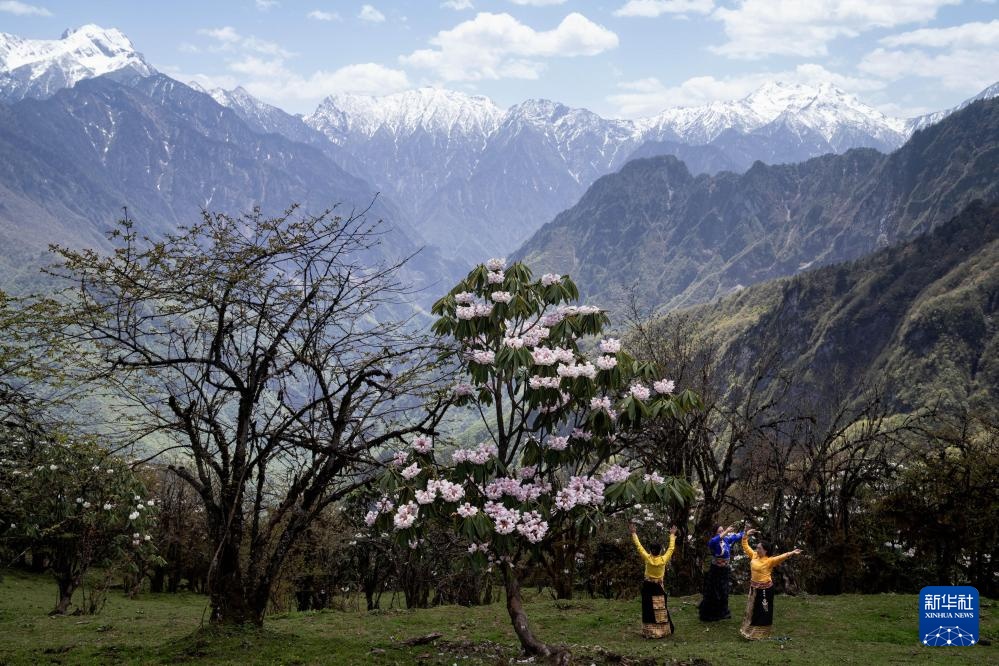5月1日,藏族姑娘在杜鹃花下跳舞。