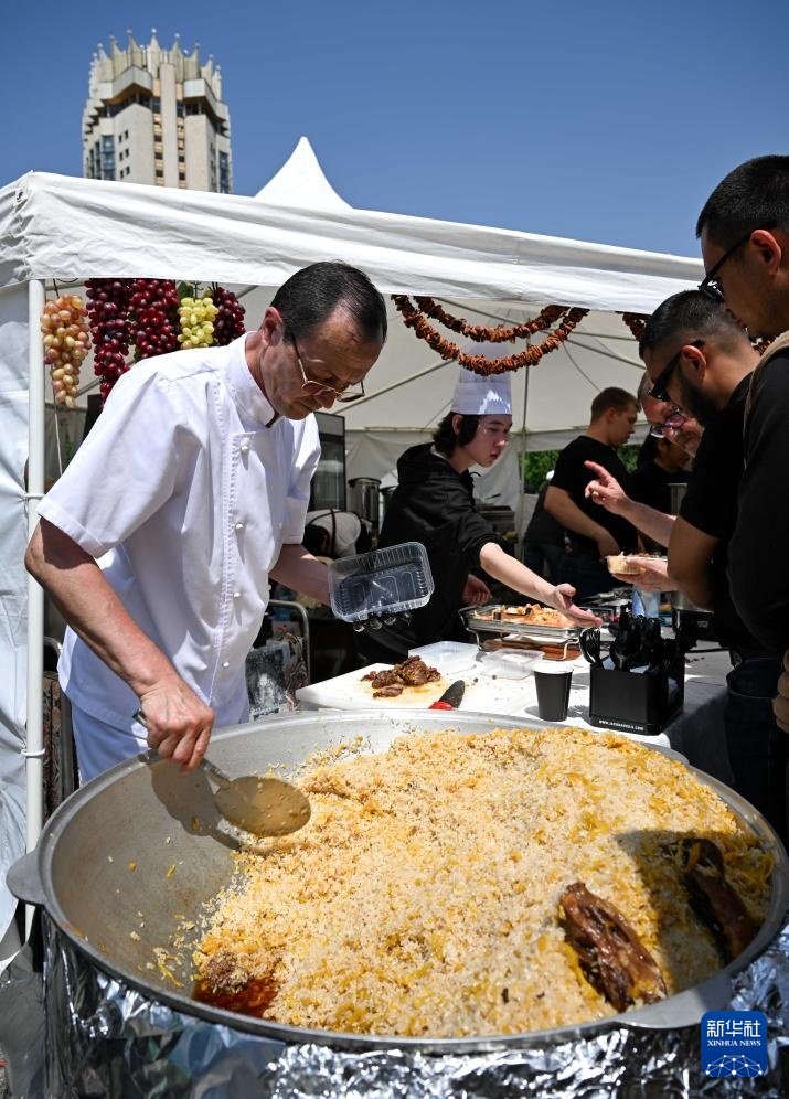 5月1日,在哈萨克斯坦阿拉木图,工作人员准备特色手抓饭。